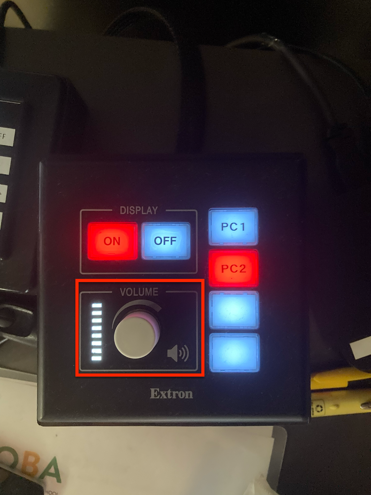**The knob controls the volume for both the speakers and the microphones in the room.**