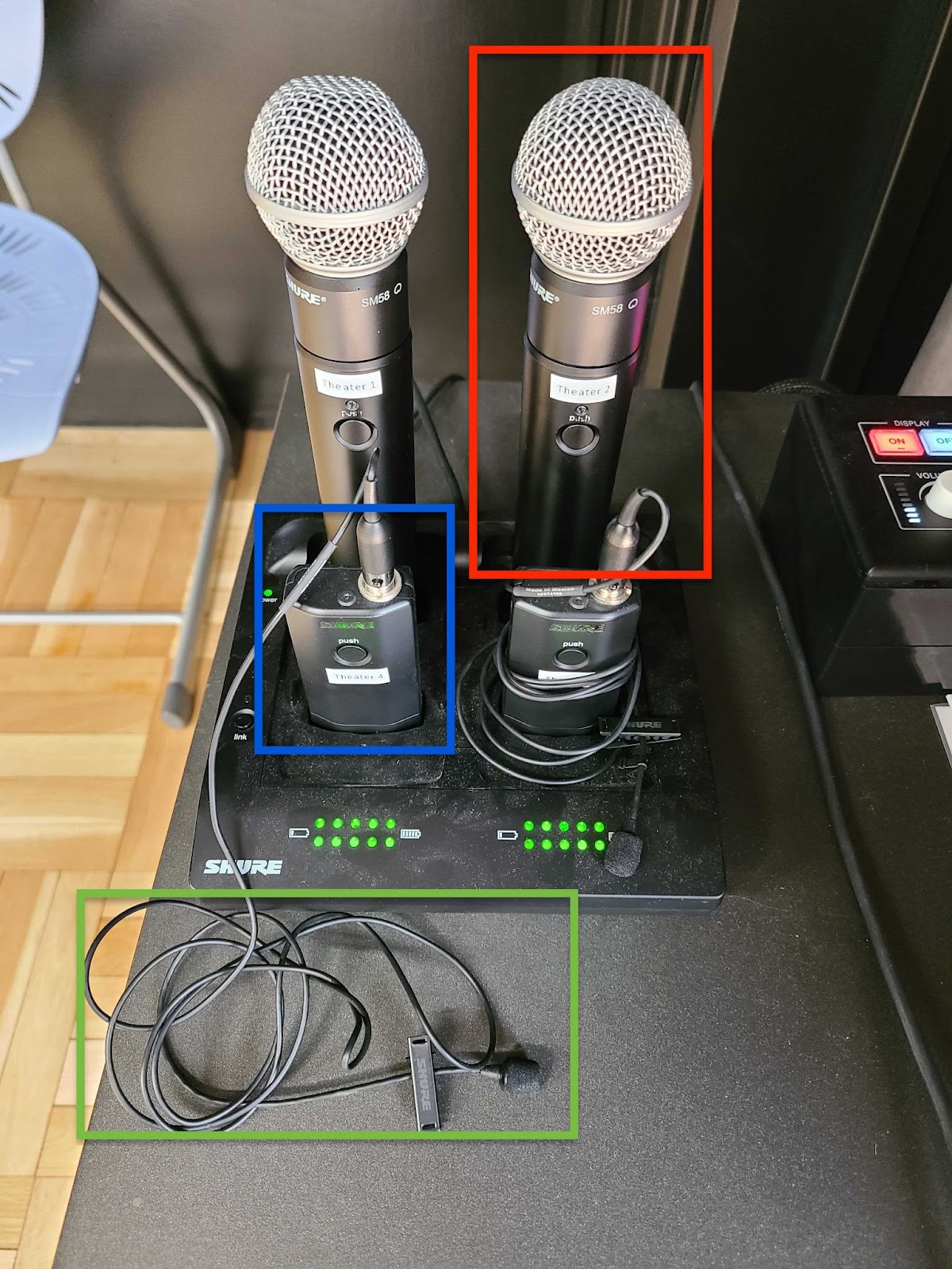 The theater room has two Handheld microphones and two Body Packs each with a lavalier microphone attached.