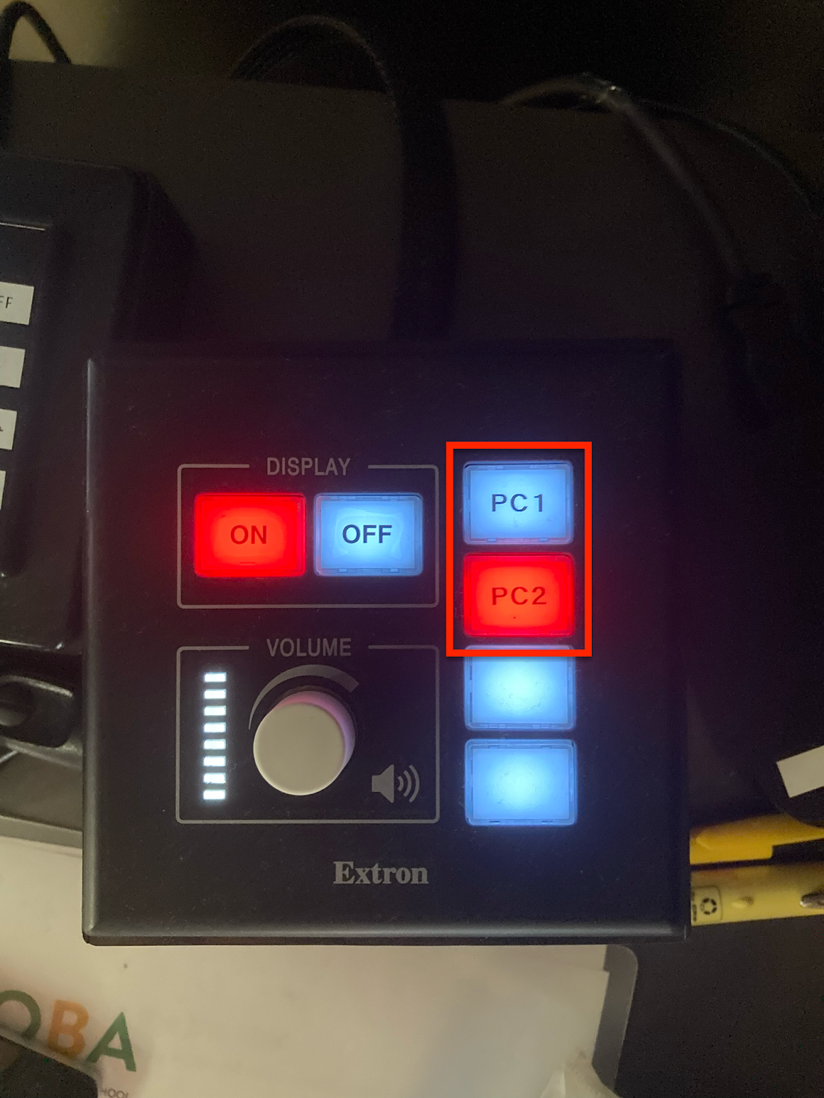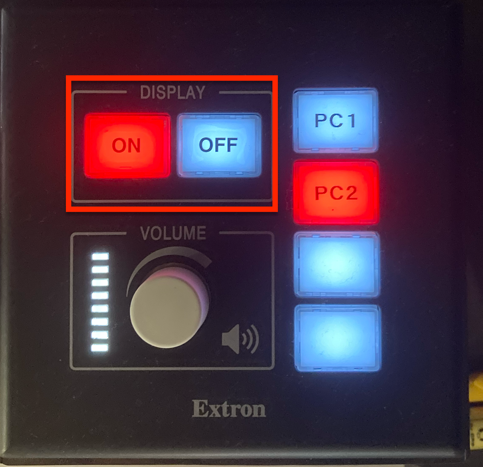 Turn on/off the display by pushing the ON/OFF buttons on the Extron control panel as in figure 1.