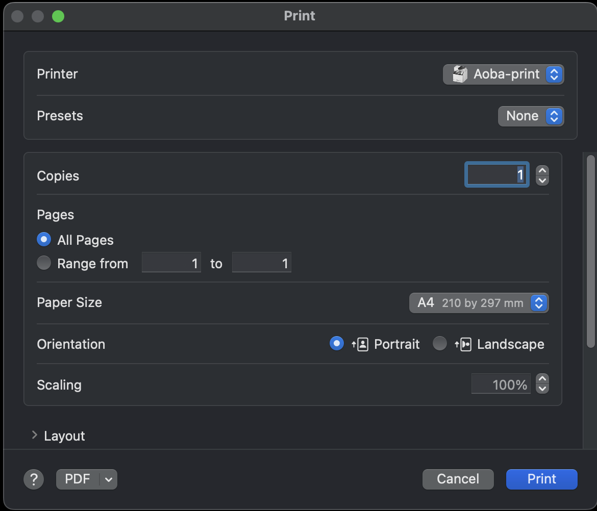 Rather than sorting through multiple printers when printing documents there is now a single printer in the print dialogue menu on your Aoba provided computer.