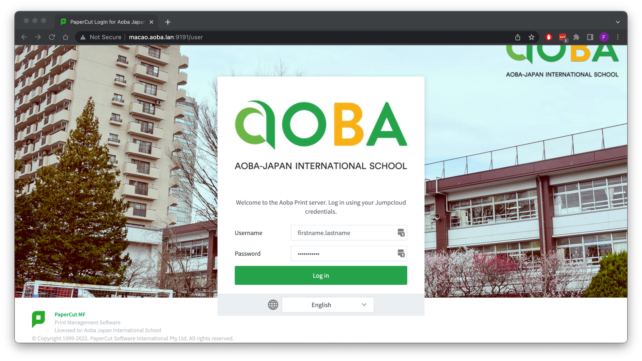 Your Aoba username and password (JumpCloud) are used to login to both the A-JIS Teacher wifi network as well as the Papercut printing service.