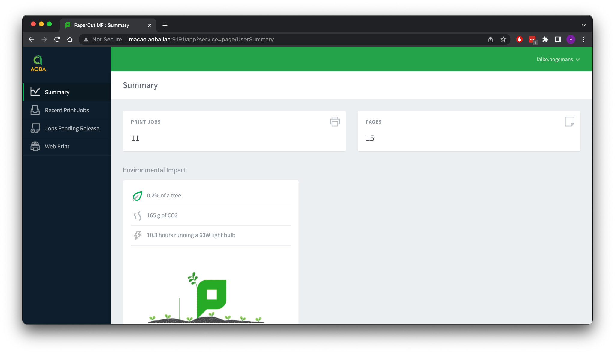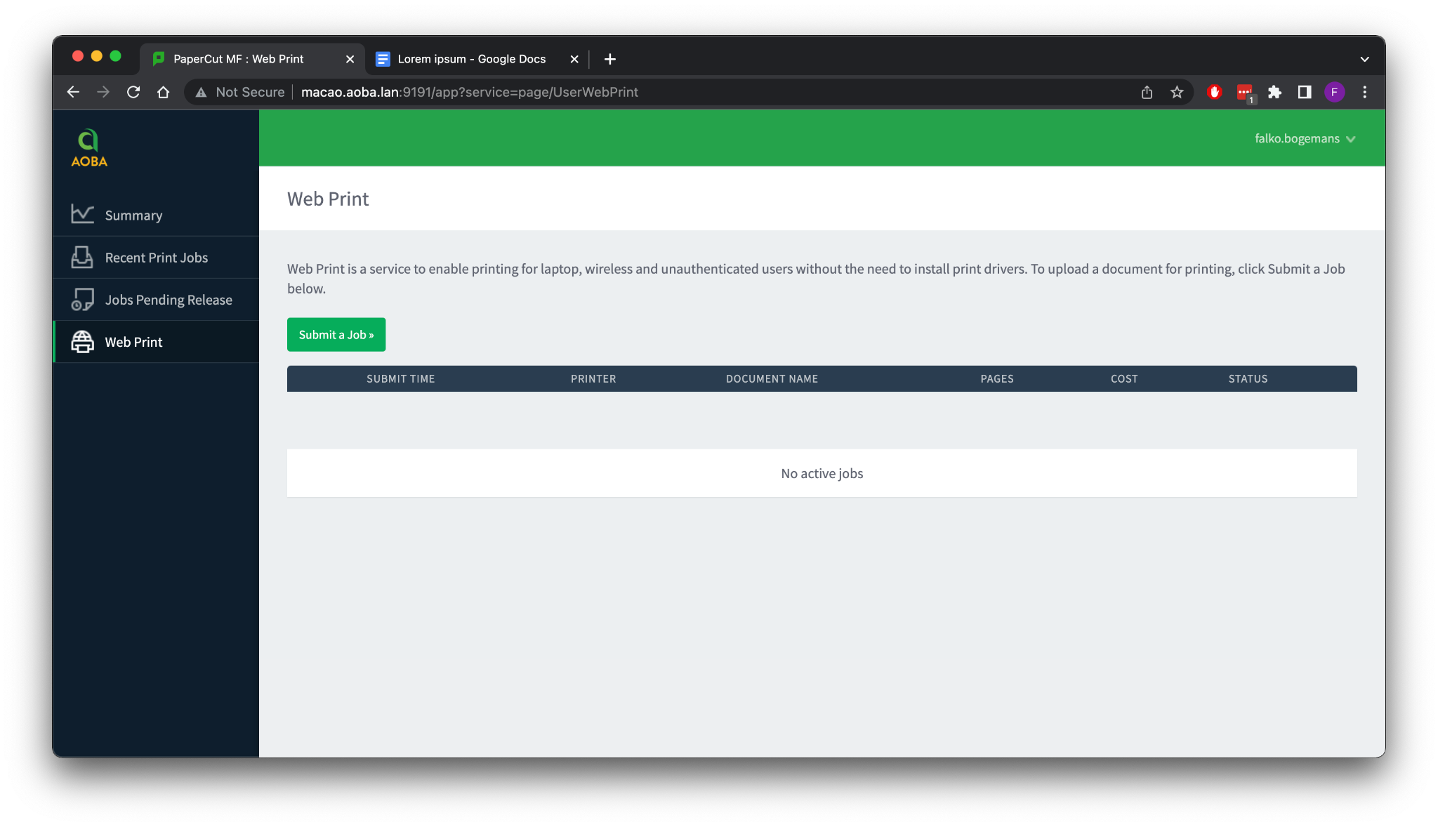 Navigate to the website URL http://print.aoba.lan:9191 in your web browser.