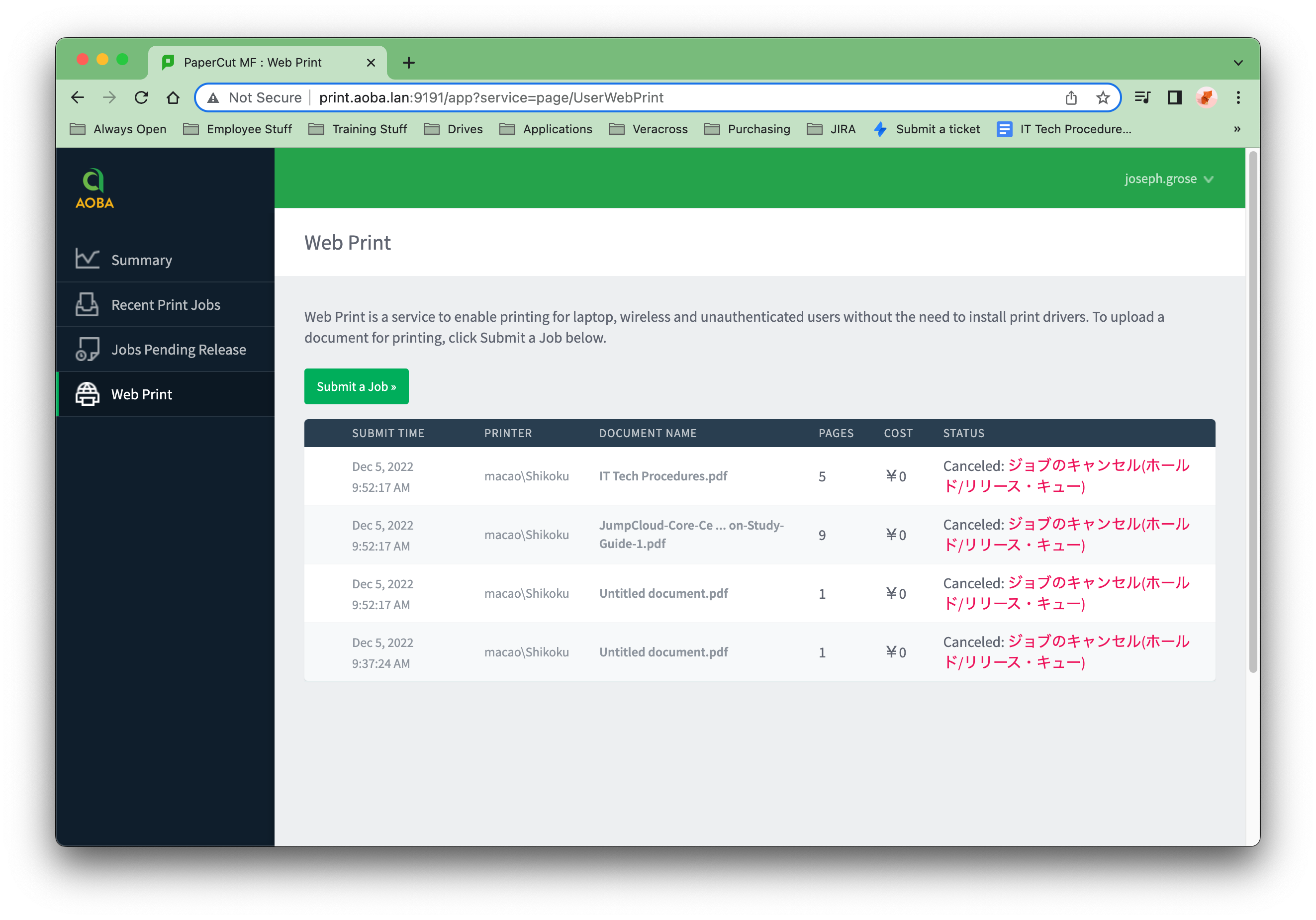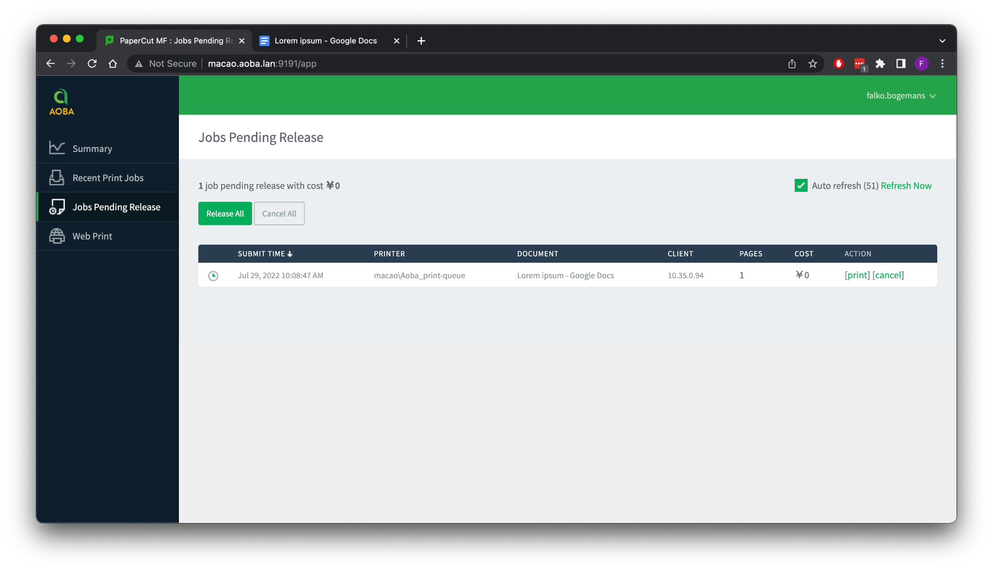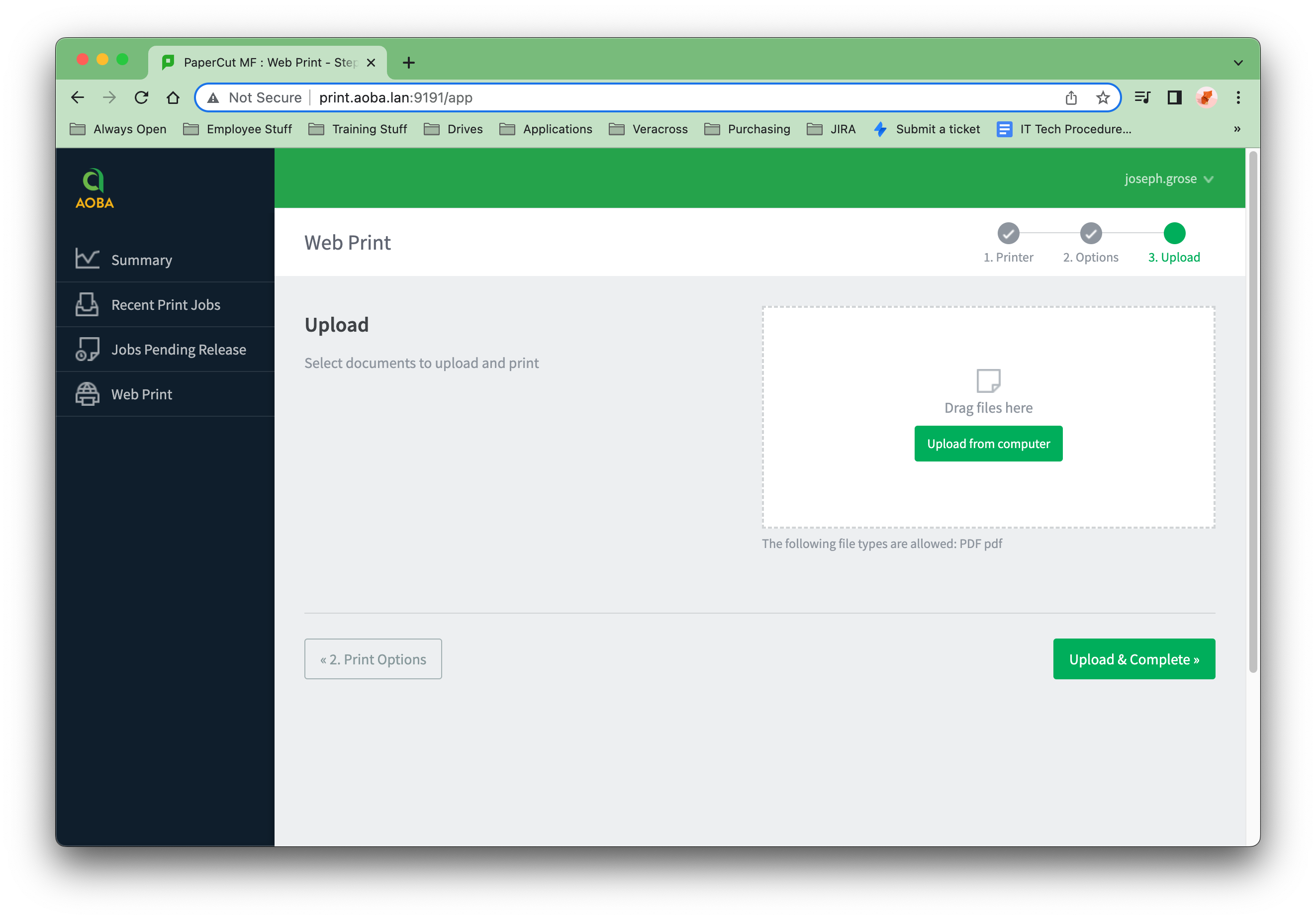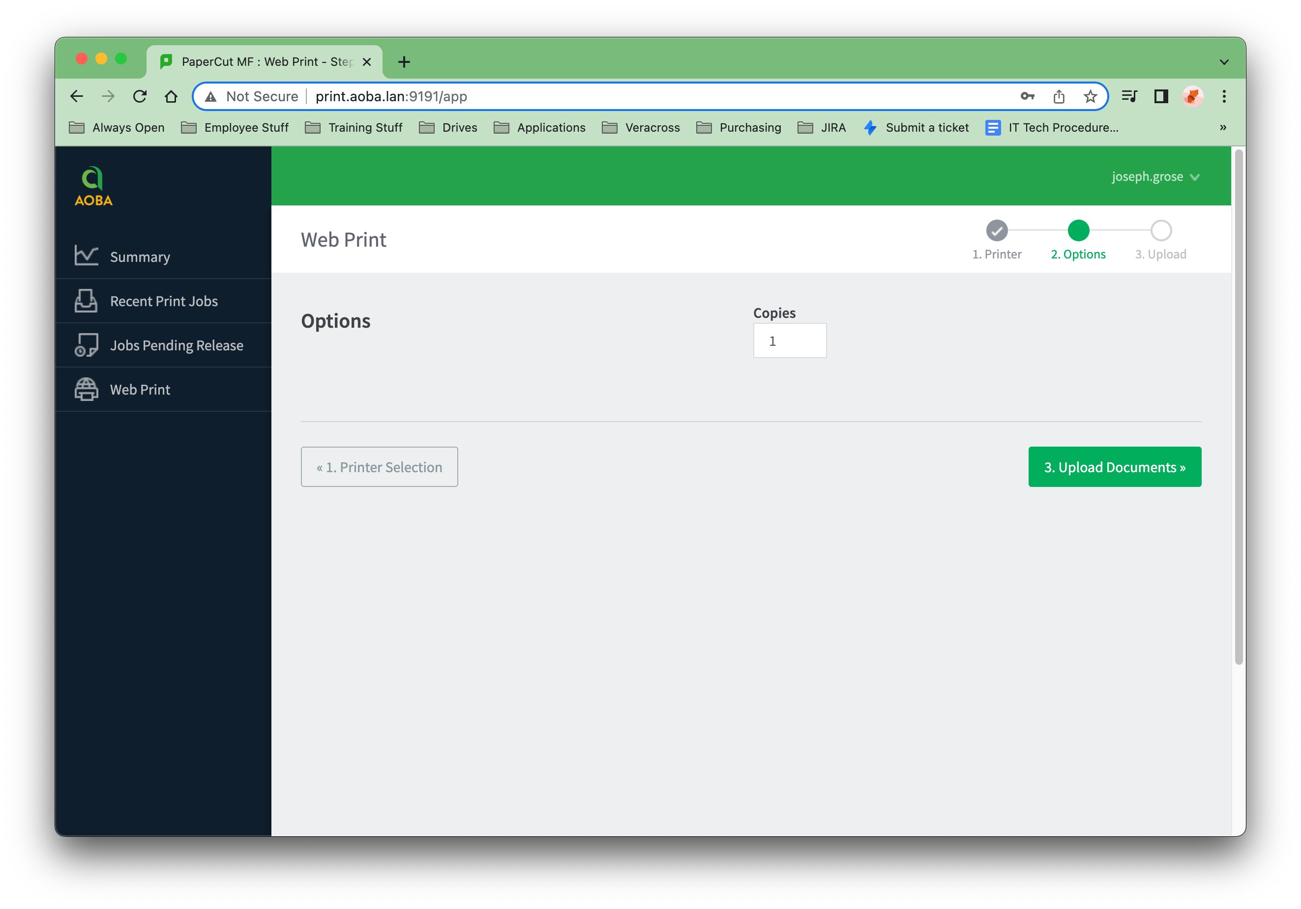 In order to log in to the application and starting using the Web Print feature, point your browser to http://print.aoba.lan:9191.