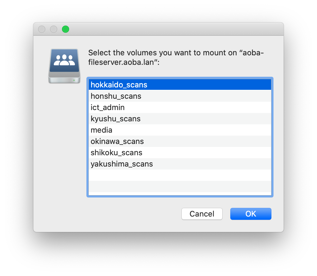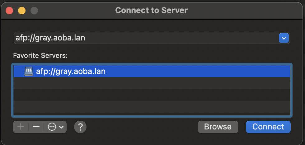 Type in the server url: afp://gray.aoba.lan/ If you are prompted for your name and password they are the same as your email or macbook login without the @aobajapan.jp domain. For example: