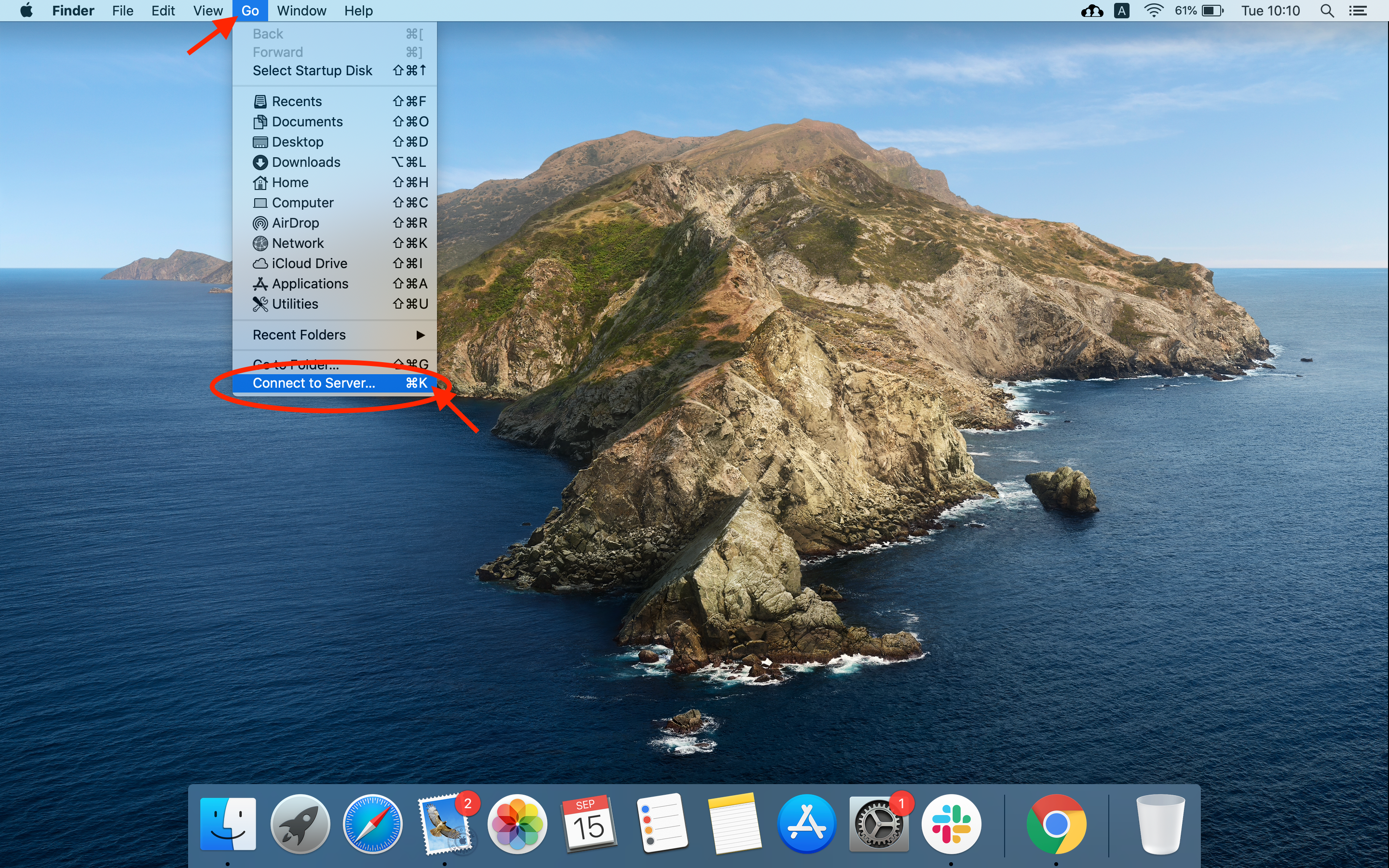 Open Finder. Click “Go” at the top of the taskbar, and select “Connect to Server”: