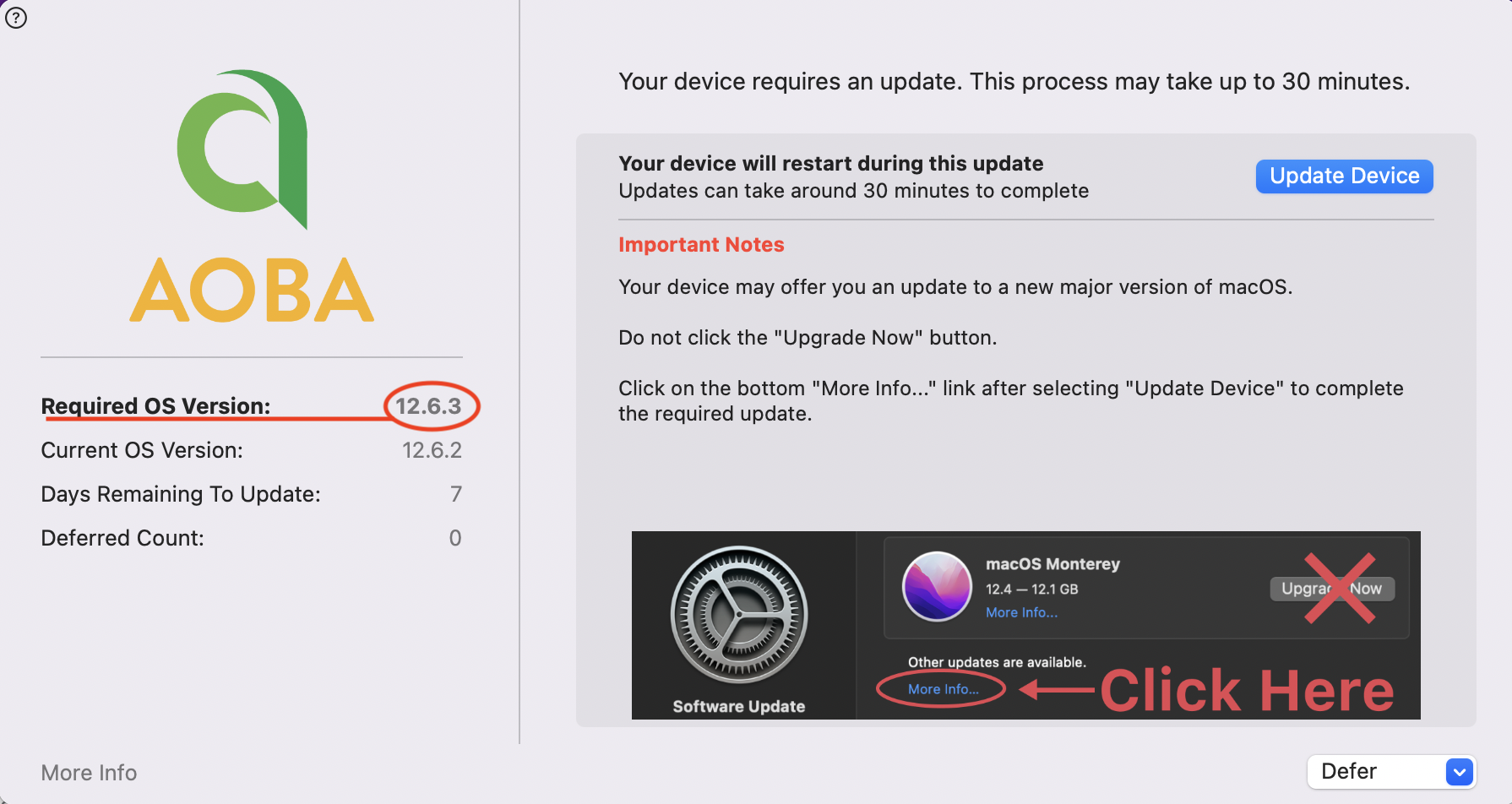 Please refer to the two information boxes below for the correct update method based on the the required OS Version number, after clicking on Update Device.