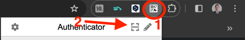 When you are asked to setup multi-factor authentication, it typically displays a QR code or at least a option to display one. Next, in your browser's extensions, [1] click to activate the Authenticator add-on. To scan the QR code, [2] click the box with a line through it. This will open the QR code tool on the web page.