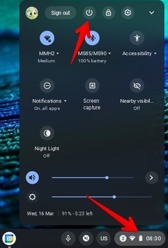 To turn off the Chrome box click the icons in the lower right side of the screen and then click the power button icon.