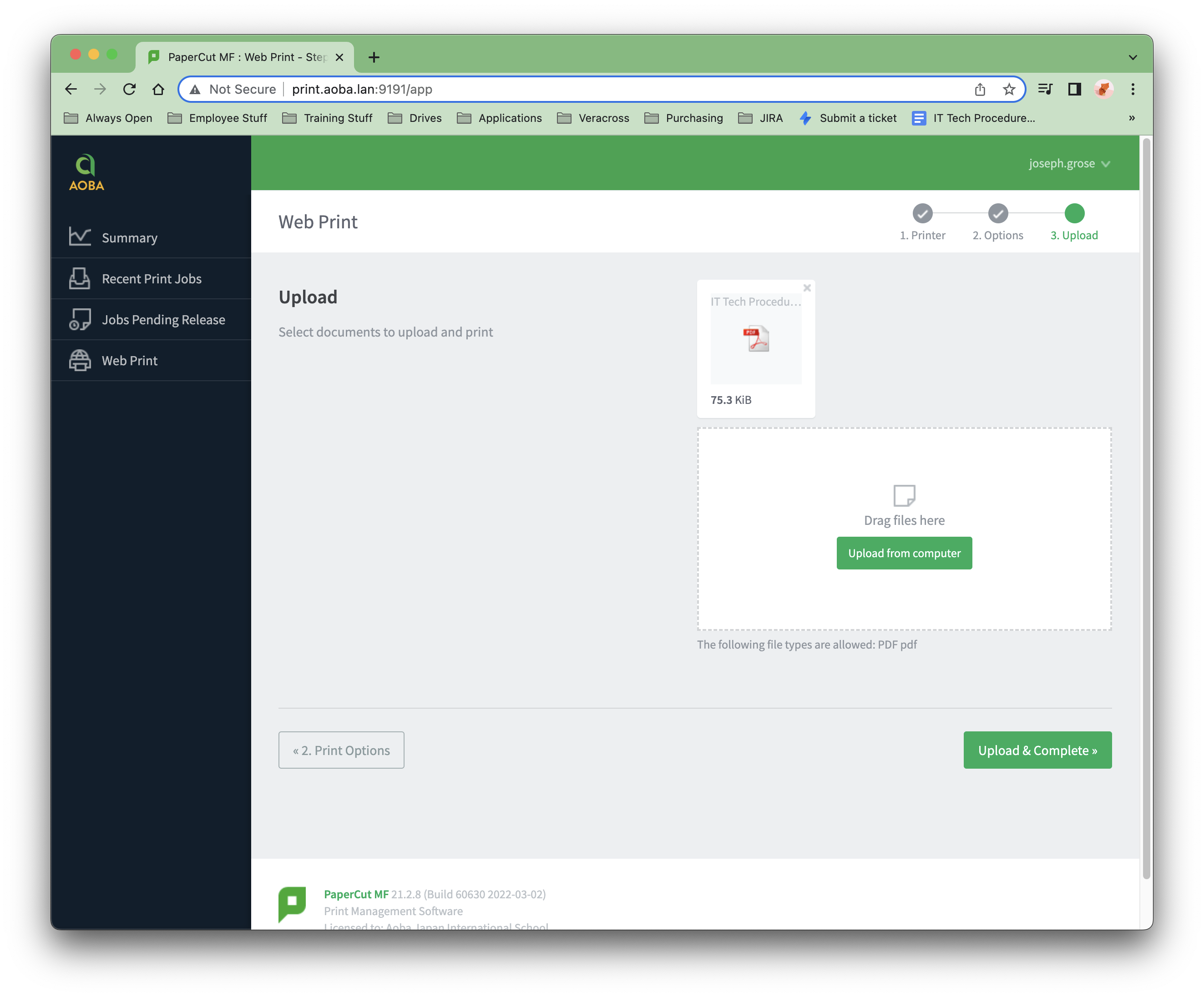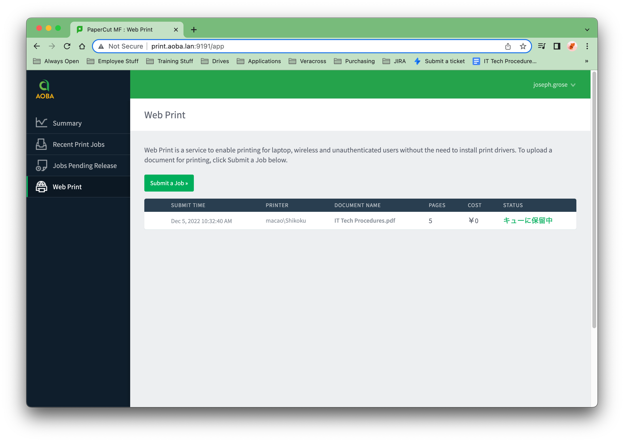 Web Printは、ノートパソコンや無線LAN、未認証のユーザーに対して、プリントドライバーをインストールすることなく印刷を可能にするサービスです。AOBAで管理されていないデバイスから印刷しようとする場合に有効な機能です。PaperCutのインターフェイスでPDF文書をアップロードして印刷することができます。